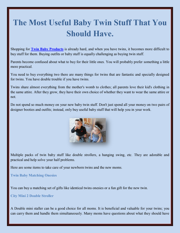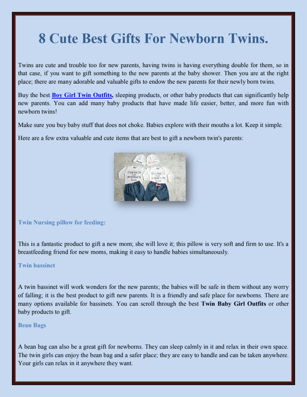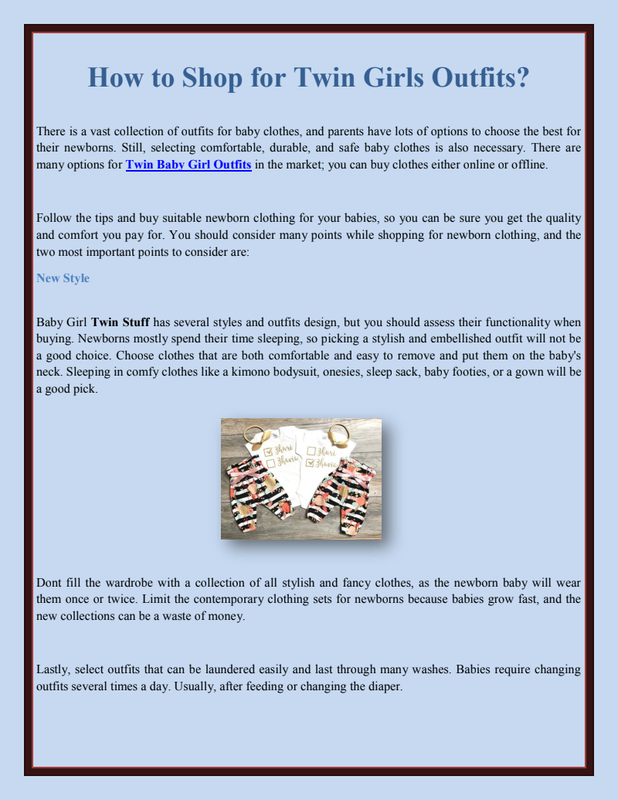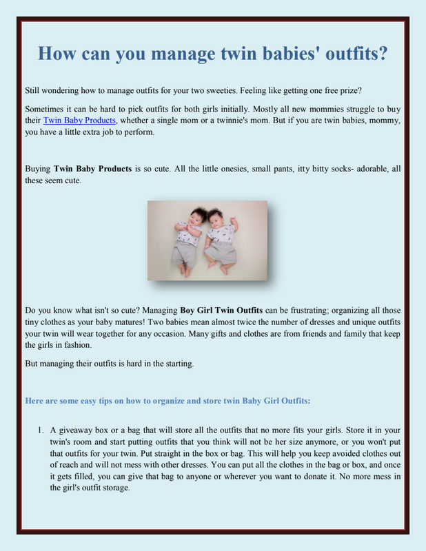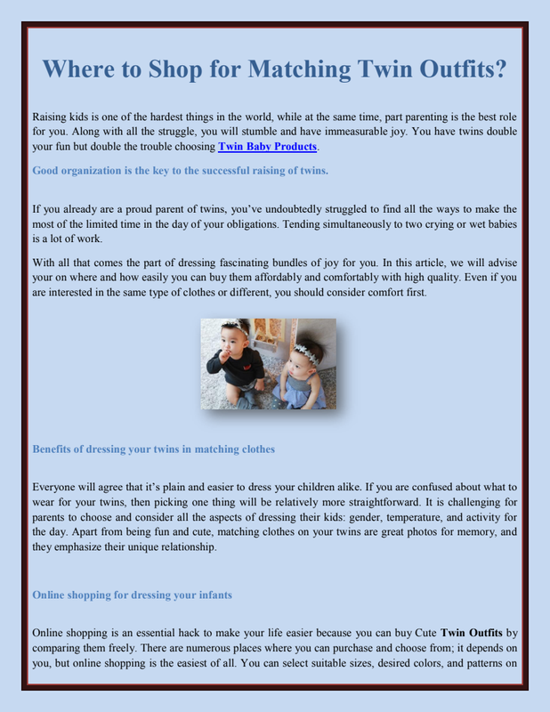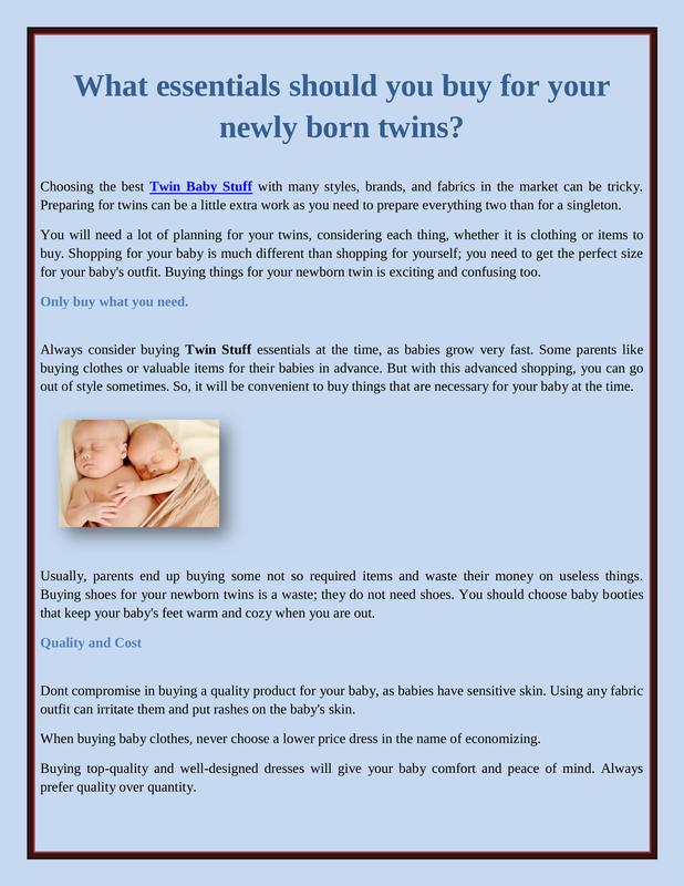 Things you should buy two are:You may be searching to buy the right products for your little one, especially diapers, onesies, swaddling blankets, baby towels, etc. Remember to buy the Twin Baby Girl Outfits made with organic fabric. Buy the best sleeping products or other baby products to keep your baby safe in the fabric.