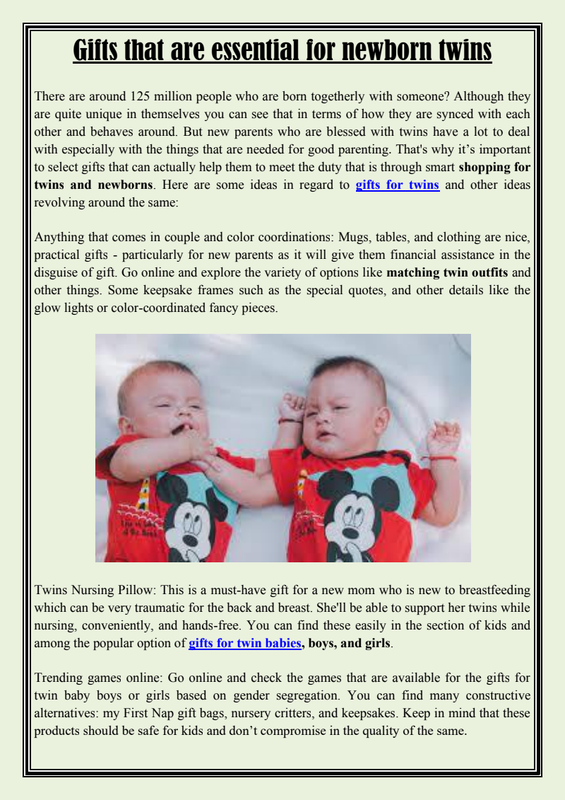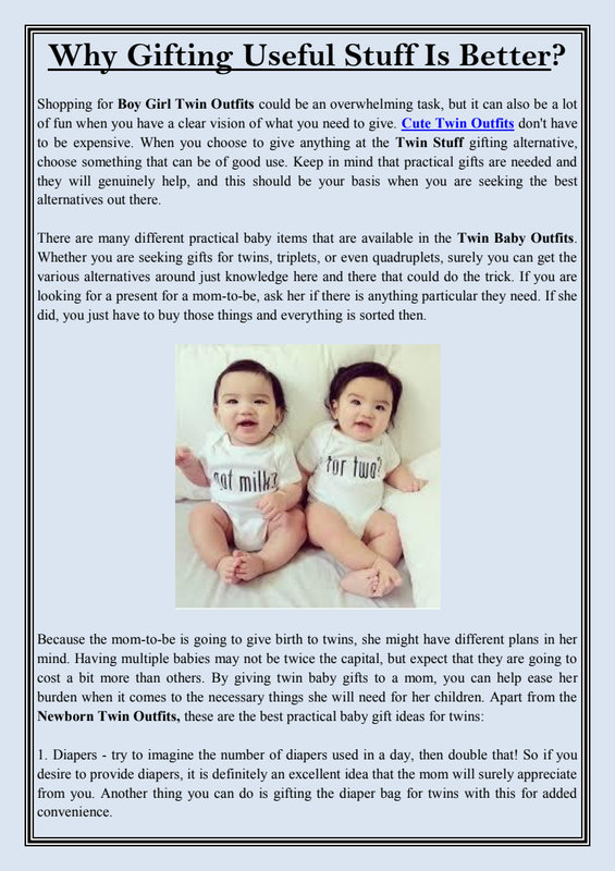 Should be fancy but more comfortable Like all the kids in the world who look 'cute' first attract the attention on what they are wearing, wow, how cute my niece will appear by wearing this piece. Let me consider it as the twin baby girl gifts. But, here we require to understand that the cute frill and shiny material could be very irritating on his skin.The plan is that the stuff is intended for kids that are of the sort which can help in comfort to the skin. Always keep soft cotton clothes in the twin baby gift sets as kids need so many clothes so they will never go to waste.